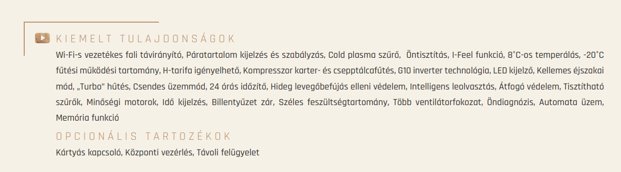 Felszerelés és beüzemelés díja bruttó 45.000 Ft, mely tartalmazza a kiszállást, a készülék helyszínre szállítását, a kültéri és beltéri egység felszerelését, elektromos betáp kiépítését aljzatba max. 5 méterig*, a kültéri tartókonzolt, rögzítő elemeket, a vákuumozást, a berendezés beüzemelését és azzal kapcsolatos dokumentumok kitöltését (pl.: beüzemelési jegyzőkönyv, garanciajegy...), valamint a takarítást.