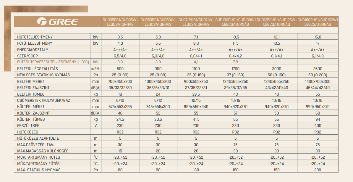 A Gree GUD71PS / GUD71W Légcsatornás Split Klíma fontos tulajdonságai: